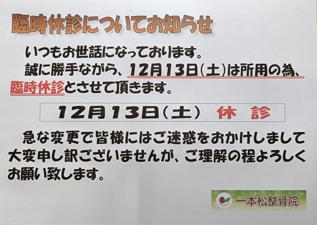 誠に勝手ながら、12月13日(土)は所用の為、臨時休診とさせて頂きます。